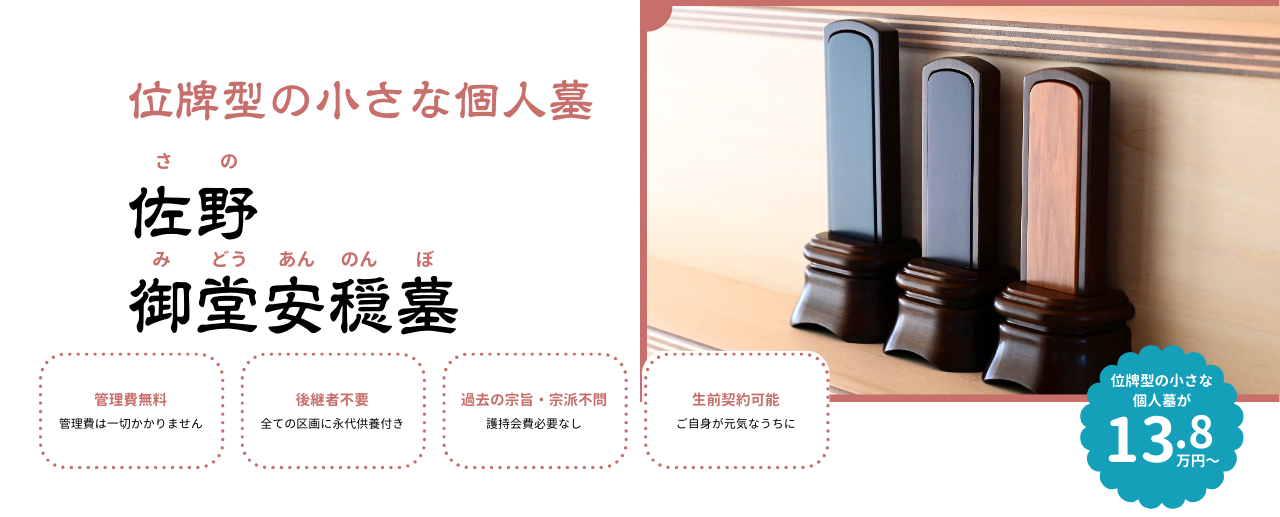 位牌型の小さな個人墓は一定期間後に合祀墓にお骨を移動するシステムを採用しております。
